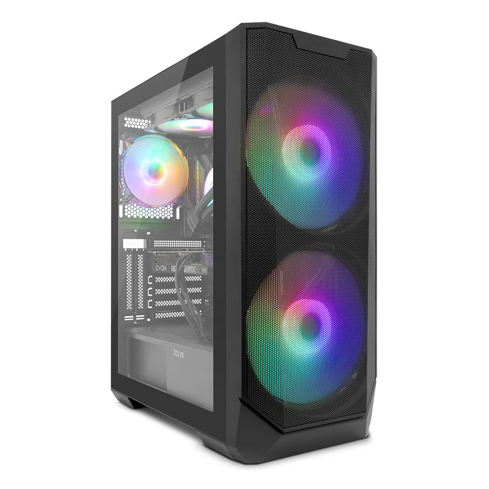 Built for versatility, this computer case displays a tempered glass side panel and metal mesh front panel, enhancing both aesthetics and cooling capabilities. Compatible with E-ATX, ATX, Micro-ATX, and Mini-ITX motherboards, it’s equipped with three ARGB fans.