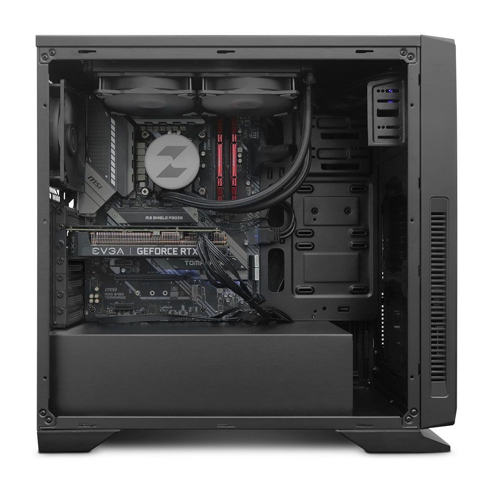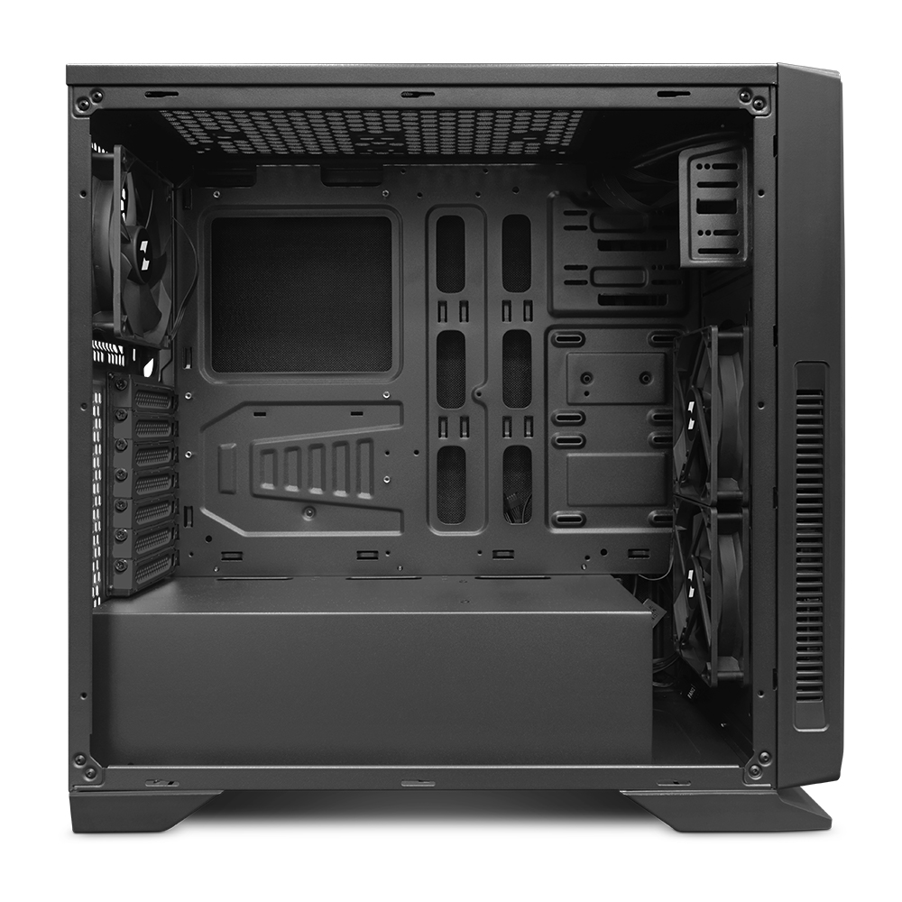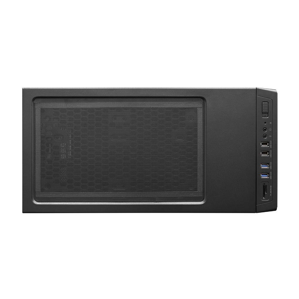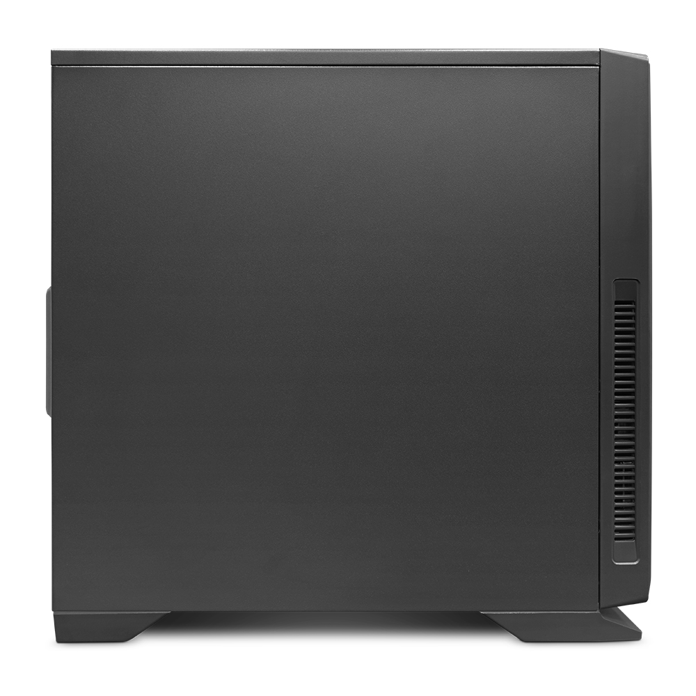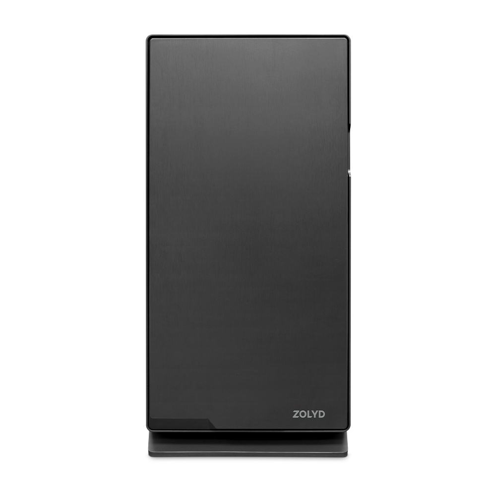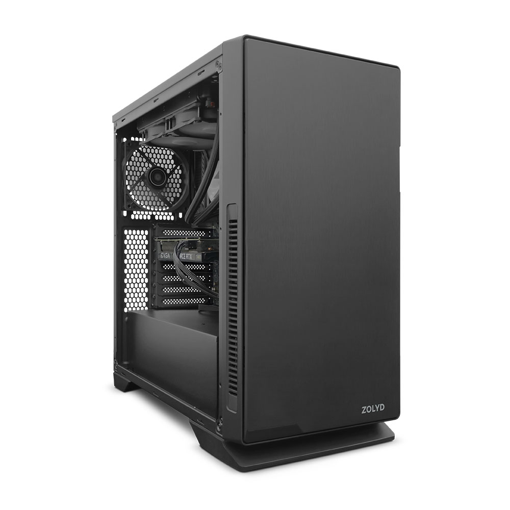 Designed with noise-dampening closed panels, Zolyd Vilorian ensures a quiet operation. The hinged front panel provides easy access to the external drive units, the fan speed controller, and a removable dust filter for the frontal fans.