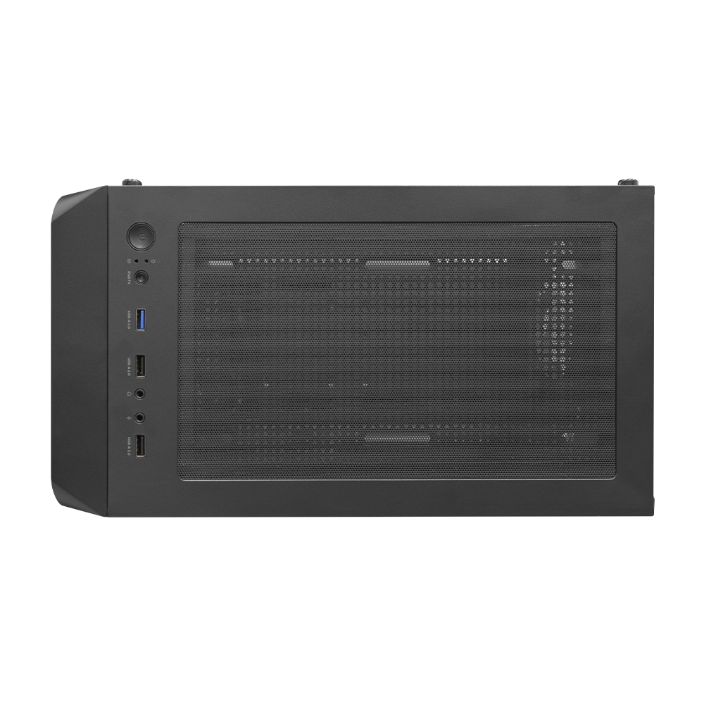 The slated front panel enhances ventilation, while three pre-installed 120 mm ARGB fans ensure excellent cooling and a dazzling light display for your setup.